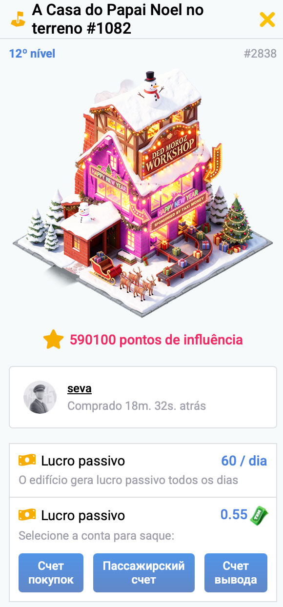 A configuração básica do táxi Relâmpago de nível 3 já é impressionante: +20% na velocidade de conclusão do pedido, +15% no custo de qualquer pedido, +85% de energia (em vez de consumo) para cada pedido! Mas isso é só o começo! O táxi Relâmpago tem um bônus cumulativo de até +525% para renda adicional em Concursos. E um bônus cíclico de até +335% a cada 20 pedidos em Torneios! E a cada 35 pedidos Relâmpago, uma recompensa de +35 é concedida a uma conta aleatória! Este é o táxi com o retorno mais rápido!